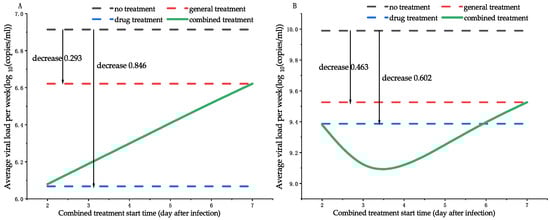 Relationship between the drug treatment start time and the average viral load in a week with combined treatment: (A) mild patients (the average viral load increased after delayed drug treatment); (B) severe patients (the average viral load decreased first and then increased with the onset of drug treatment).