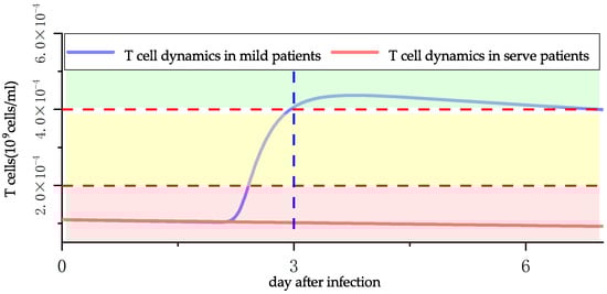 Overall, the third day after infection is the best time for combined treatment of potential severe disease patients, and T-cells generally appear in the bodies of severe disease patients after the third day. As a result, the detection of T cells in vivo should be done when a patient has symptoms. If the value is lower than 2 × cells/mL, drug treatment should be initiated (Figure 11). We suggest that the content of T cells should be detected, and the treatment plan should be adjusted in a timely and accurate manner with clinical examination.