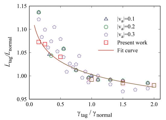 This is a time-dependent equation that is solved by using the explicit finite difference method on a fixed grid and time stepped with a simple Euler scheme. To verify the model and code, a case with identical conditions to Yin’s study [23] is carried out. Figure 1 shows the average shape change of a tagged cell over the average shape change of a normal cell. It can be seen that the points of the present data are distributed with the same trend as the reference data, within the margin of error, which proves that the model and code used here are basically correct. The data of the present work can be described as a function of , which is .