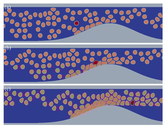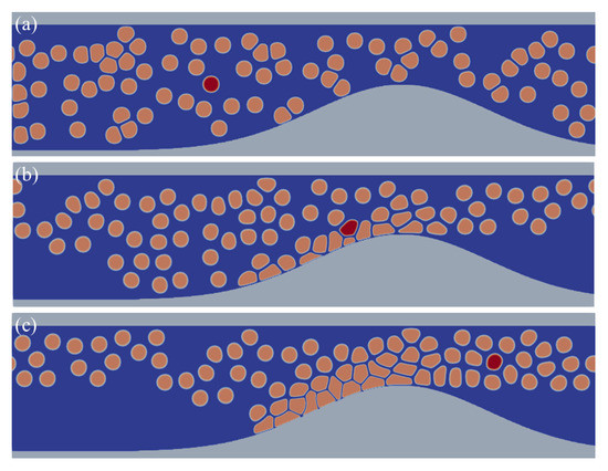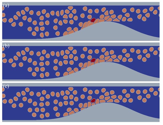 Figure 3 shows the evolution of the cells–vessel system with the dimensionless initial active velocity of the cell , the block rate and the dimensionless cellular elasticity . The cells are randomly distributed in the lumen at the beginning, and the distance between the centers of two cells is not less than to reduce the degree of cell overlap. To analyze the migration and dynamics of an individual cell, a randomly chosen cell is tagged in dark-red color. The gray on either side is the vascular walls with protruding atherosclerosis. At the initial stage, the blood cells are almost round with little deformation and gathering, as shown in Figure 3a. Later, the tagged cell moves near to the narrowest position of the vessel, and it deforms significantly due to extrusion, as shown in Figure 3b. After that, the tagged cell almost restores its original shape, as displayed in Figure 3c. On the whole, the cells migrate simultaneously with the blood flow from the left side of the vessel to right; the atherosclerotic plaque leads to the accumulation and deformation at the narrowest position. This demonstrates that the multiple phase-field model can be used to model the dynamic behaviors of cells in a vessel with an atherosclerotic plaque.