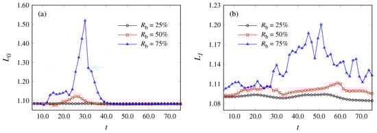Figure 5 shows the evolutions of the dimensionless perimeters of the tagged cells s and the average of the dimensionless length of all cells s for the simulations of block rates , and with . From Figure 5a, it can be observed that for rises sharply around s, reaching the peak at s. The maximum value of for exceeds 1.5. This means that the perimeter of the tagged cell increases by 50%. When , remains nearly constant, indicating that the tagged cell deforms barely. By combining with Figure 4, it can be found that the tagged cell just approaches the atherosclerotic plaque; meanwhile, the starts increasing at s. Therefore, it is the atherosclerotic plaque that results in the deformation and the blockage of blood cells.