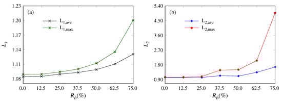 Furthermore, the cells are considered to have elliptic shapes with a major axis and a minor axis. The length ratio of these two axes is proposed to characterize the deformations of cells. Here, is used to represent the length ratio of these two axes of the tagged cell i. Figure 6 displays the maximum and averaged values of the dimensionless perimeters of all cells , and of the ratios and in the simulations of , and various block rates , and . It can obviously be found from Figure 6 that all the four indicators increase simultaneously with the increase of the . The increased amounts of and between every two adjacent s are less at a lower than those at a higher . Therefore, the length ratio of the major and minor axes can also be selected as an indicator to characterize the cell deformation.