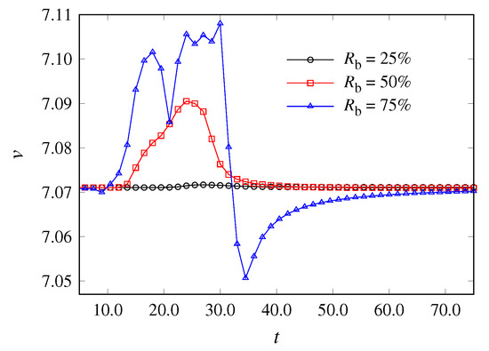 Figure 15 shows the time evolution of migrating velocities for cases of , and . It can be found that the migrating velocity burst more than three times during the simulation in the case of , whereas the velocity varies gently and with low frequency in contrast for . This implies that the deformation of a cell is increased with the increase of the initial active velocity. The higher the value of , the more obvious the effect is. According to Bernoulli’s principle, where the pressure is higher, the blood flows faster, meaning that the blood pressure and pulsatility will be reflected in the blood flow rate, with the initial active velocity of the blood cells at a microscopic level.