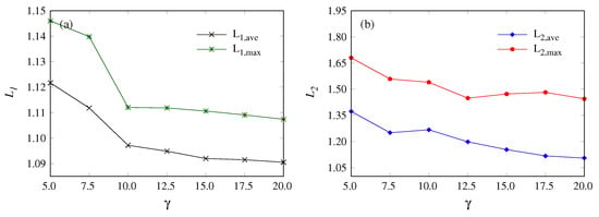 Evolution of the average and maximum of (a) the dimensionless lengths of the perimeter of all cells (, ) and (b) the length ratios of the tagged cell i (, ) as functions of in the condition of and .