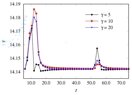 Figure 8 displays snapshots of blood cells and the atherosclerotic vessel for the simulations of and at with different cellular elasticities. It can be found that the deformation of cells in Figure 8a is more notable than that in Figure 8b,c. The deformation is caused by the extrusion force when the cells pass the atherosclerotic plaque. With the increase of the elasticity of cells, the deformation of cells becomes difficult when cells move across the atherosclerotic plaque. Figure 9 shows the time evolution of and for simulations of various elasticities. It can be observed from Figure 9a that the up and down trends of three curves of versus time t are almost the same. The increasing and decreasing rates of are obviously greater than those in the other two cases. The increase of is inversely related to . The same feature is also shown in Figure 9b, which depicts the evolution of dimensionless perimeter for the simulations. Compared with the case of higher elasticity, the cellular deformation with lower elasticity has more volatility.