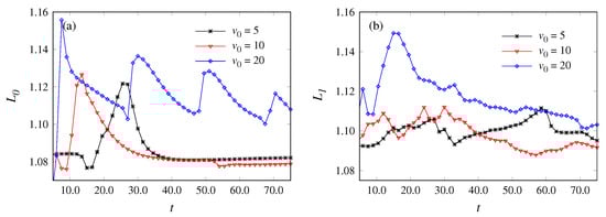 Evolution of (a) the dimensionless perimeters of the tagged cell s and (b) the average of dimensionless length of all cells s for the simulations of various initial active velocities , , with , .