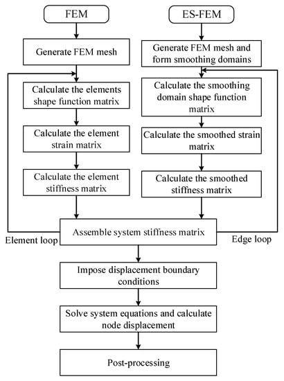 The ES-FEM calculation process is similar to that of the FEM, except that the ES-FEM needs to construct a smoothing domain on the basis of the FEM model and modify or reconstruct the strain field. As shown in Figure 1, many techniques designed for FEM can be adapted for ES-FEM. In short, the difference between the ES-FEM and FEM is that all calculations of the FEM are based on elements, while all calculations of the ES-FEM are conducted on smoothing domains.
