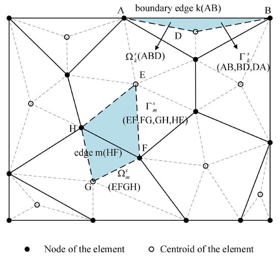 As shown in Figure 2, on the basis of the polygonal element mesh, the smoothing domain is constructed. The problem domain is divided into polygonal elements, including edges. The edge-based smoothing domain is composed of two nodes connecting one edge and the centroid of its adjacent elements. The two nodes A and B connecting edge AB and centroid D of the triangle element form the smoothing domain (ABD), see Figure 2. The construction of the smoothing domain, such as the discrete problem domain, must follow the principle of no gap and no overlap, that is, , , and .
