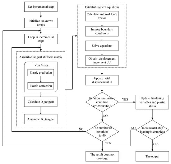 Solver: The solver uses incremental S-FEM to solve the elastoplastic problems, which is the main part of the whole software package. It is mainly categorized into: (1) assembly of the elastic stiffness matrix and (2) incremental loading and semismooth Newton method iterations to solve the system of equations. The calculation procedure of the incremental loading and semismooth Newton method iterations of the solver is illustrated in Figure 4.