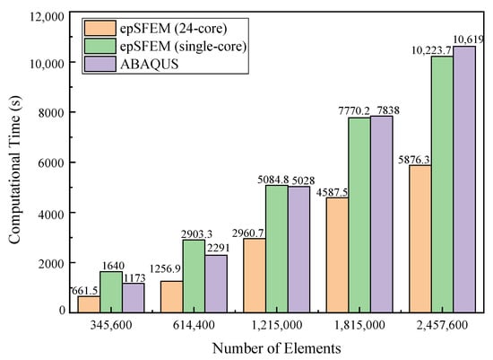 Compared with FEM, the calculation of the S-FEM has the following two differences. First, we need to construct the smoothing domains and modify or reconstruct the strain field in the S-FEM. Moreover, because the smoothing domain may involve a portion of adjacent elements, the memory requirements for S-FEM will be larger [7]. The two differences mentioned above may lead to a higher computational cost for the S-FEM than the FEM for the same grid structure. However, given the calculation cost, the results calculated by the S-FEM model are more accurate than the FEM, and thus, achieve higher efficiency. To make S-FEM more applicable to large-scale engineering problems, parallel strategies of multicore CPUs and/or multicore GPUs are usually used to improve and optimize the computational power of S-FEM.