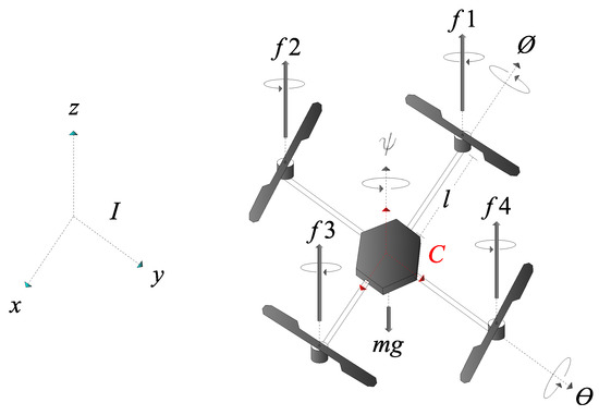 The aerial experimentation vehicle (referred to in further sections as drone, quadrotor, or UAV) has four actuators. The potential motions of the UAV are specified by manipulating the actuators; such movements are: (a) movement along with the x-axis; (b) movement along with the y-axis; and (c) movement along with the z-axis. To achieve the mentioned movements (x, y, z), the quadrotor’s orientation must be manipulated, which is accomplished by modifying or changing the pitch angle , roll angle , and the yaw axis , defined with regards to the UAV’s orientation framework. Taking this into consideration, it is helpful to mathematically specify how the quadrotor’s orientation is represented. As it is shown in Figure 1, the quadrotor is subject to the frames of reference C and I. Accordingly, C represents the non-inertial frame of reference, that is, a coordinate axis whose center is the quadrotor’s mass center; whereas I represents the inertial frame of reference, which is subject to the land surface (ground or platform from where the drone starts its navigation).