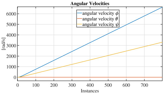 The operation point is settled around the equilibrium point, in which the quadrotor is in a stationary state, to perform the reduced rotational dynamics modeling; that is, it is regarded that . The necessity to explore these reduced dynamics stems from the fact that the dynamics defined by (43) are not simple. It is essential to underline that the approach described above only works for flight trajectories with no abrupt transitions. Thus, the Euler angles will be small.
