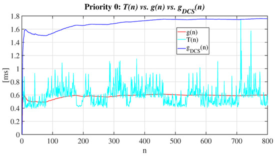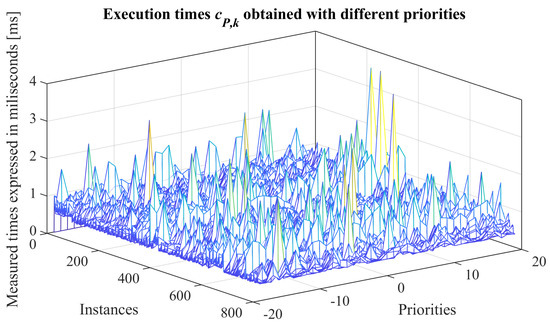 Considering the facts stated above, and according to the approach proposed in this article, an algorithm that interacts with or simulates a physical process in real time has a different kind of temporary computational complexity in comparison to one which is not implemented in real time. Therefore, the simulation of the model of a quadrotor achieved by means of an online system, (or off-line in the worst-case scenario) which depends on the number of iterations, and then, considering them as its entries, it would clearly have a linear kind of temporary computational complexity. Taking into account the previous analysis, it is evident that functions seen in Figure 15, Figure 16, Figure 17, Figure 18 and Figure 19 have a complexity of the constant kind. This fact also justifies that the quadrotor (also known as drone) real-time simulation presented in this article has a temporary computational complexity of the constant kind and can be described using asymptotic notation big O. Regarding the functions defined by (68), and which are observed in the previously mentioned figures, it can be assumed that the fact of using priorities close to in the quadrotor’s real-time simulation modifies the discrepancy . This fact denotes a certain tendency to decrease it, and consequently, it could be interpreted that there is a strongly bounded dependency between c and p, in such a way that any modification of the value of p would imply a modification of the value of c. This interpretation is mistaken, as in this manuscript a constant value of c has been used in the definition of function . According to this, the most valid interpretation lies in the fact that, modifying the priority in a RTT’s execution, the discrepancy is modified because the processor increases or decreases the number of task displacements according to the priority chosen and a scheduling criteria. Thus, when using a priority , the processor assigns the maximum quantity of hardware resources to the execution of the task in progress, reducing then the possibility of displacement by the necessity to attend any process requiring attention. This generates smaller execution times , and consequently, the function which converges to smaller values is defined, these being delimited by the function , which achieves convergence also to smaller values.