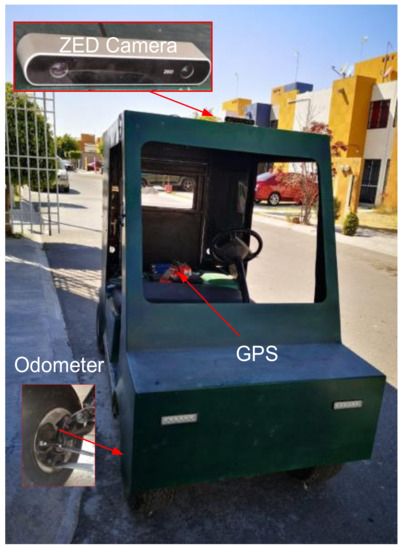 The experimentation platform is an AEV developed in the TecNM autotronics laboratory in Celaya. Figure 1 shows the AEV and its sensors used in this experimental work: the odometer, GPS, and the stereo camera. The first is the FC-51 sensor, which is placed on the motor’s shaft to measure displacement from the number of revolutions (pulses) made by the engine and interpreted by a Raspberry Pi 3 mini computer. The second one is the GlobalTop FGPMMOPA6H, which uses the MediaTeK GPS chipset MT3339, and it can send position data over UART. The third is a ZED (StereoLabs, Orsay, France) camera, which allows one to perform stereoscopic visual odometry through the software included in it.
