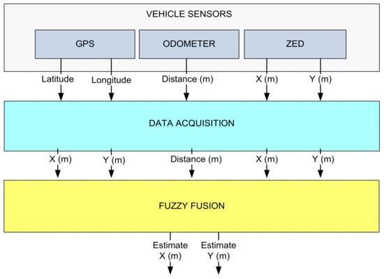 A fundamental module of autonomous land vehicle navigation systems is absolute location, which in several works consists of a combination of data from different sensors including the GPS sensor [1]. It should be noted that high precision is required in the positioning of the vehicle to provide optimal security service. Recently, high precision positioning systems with an error of a few centimeters have been developed using cameras, inertial measurement unit (IMU), and light detection and ranging (LiDAR), among other methods [2,3,4,5,6]. The fundamental goal of data fusion is to obtain a lower probability of estimation error and greater reliability by using data from multiple sources. They are defined as complementary when the information provided by the input sources represents different parts of the scene and therefore could be used to obtain more complete global information. There is also redundant data fusion, which is used when two or more input sources provide information about the same objective and that information can be used to increase confidence, as well as a cooperative one when the information provided is combined with new information that is usually more complex than the original information [7,8]. In this sense, stereo visual odometry (SVO) sensors have become crucial for their ability to estimate camera movement based on images. SVO uses a relative scale to estimate the position and orientation of an agent using the images of one or more cameras attached to it. The SVO technique has been applied in the development of different vehicles such as autonomous vehicles, unmanned aerial vehicles, and submarines. Indeed, SVO was used to supplement the odometry of the wheel in the first exploration missions to Mars [9,10]. However, measurement noise and miscalibration induce an error (drift) in the estimated position, causing the heading reconstruction to deviate from the actual vehicle path. Slipping of the vehicle’s wheels in the sand caused the wheel odometry to malfunction, requiring a more accurate way to measure movement. For instance, estimating the relative displacement of the observed environment between images provides much more accurate results. Several works focused on various areas that are relevant in the image aspect. Such is the case of the topic of movement [9,11,12,13], in which the movement between two images of an environmental region is estimated by analyzing the relative displacements of the camera and the correspondences of characteristics present in the environment using various methods. On the other hand, there are studies focused on techniques for estimating depth from image [14,15,16,17,18,19,20], ranging from medical applications to applications of convolutional neural networks for robots. Several studies of embedded navigation systems are documented in the literature, showing how fuzzy systems can achieve this interaction by reducing error. For example, in [21], a study on an adaptive Kalman filter design based on fuzzy innovation is presented for the improvement of vehicle positioning performance in a dense urban environment. A fuzzy system is proposed to adaptively apply the covariance of the position precision, dilution measurement noise (DMN), the number of satellites that can be received, and the difference between the predicted position and the measurement position. In addition, the heading is checked and the covariance of the measurement noise of the inertial measurement unit and the on-board diagnostics (OBD) is applied based on the driving state of the vehicle. The proposed method corrects the MEMS-IMU yaw rate with the steering angle value obtained from the sensor on the vehicle and replaces the estimated MEMS-IMU speed by using the speed calculated from the 4-wheel revolutions per minute (RPM). This reduces the estimation error in the position, speed, and attitude of the MEMS-IMU.