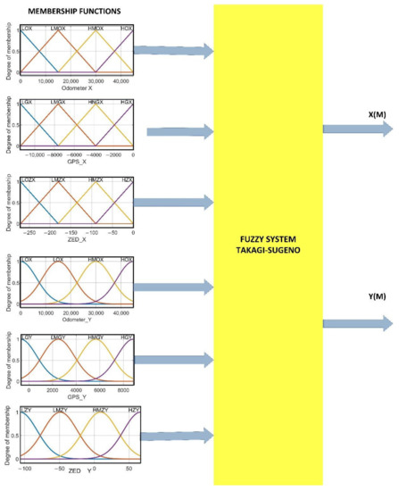 Fuzzy logic is a discipline of Artificial Intelligence (AI) that is a generalization of classical logic. This has the advantage of using multiple degrees of membership between 0 and 1. Fuzzy inference systems (FIS) are used to reduce the uncertainty in position measurements. These have two fundamental parts, which are fuzzification and inference. The first aims to convert a numeric variable to linguistic variables. The second is made up of several linguistic rules that relate the input and output variables of the system. The Takagi-Sugeno fuzzy model is characterized by using linear functions of the inputs. Figure 5 shows the FIS proposed for the estimation of the ANFISedit position with MatLab 2019 [27,28,29].