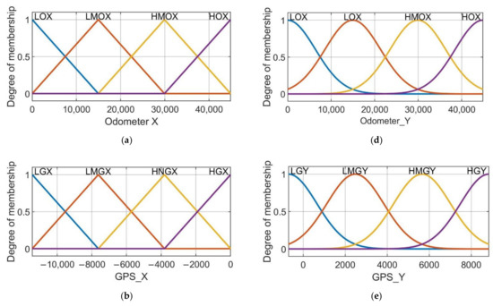 Membership functions used in the proposed model. (a) Membership functions for odometer data of latitude fuzzy system. (b) Membership functions for odometer data of longitude fuzzy system. (c) Membership functions for GPS data of latitude fuzzy system. (d) Membership functions for GPS data of longitude fuzzy system. (e) Membership functions for ZED camera data of latitude fuzzy system. (f) Membership functions for ZED camera data of longitude fuzzy system.
