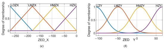 The membership functions used for latitude are of the triangular type and for longitude they are of the Gaussian type, as shown in Figure 6a–f. In these subfigures it is possible to appreciate the shape, the parameters, and the number of membership functions for each input.