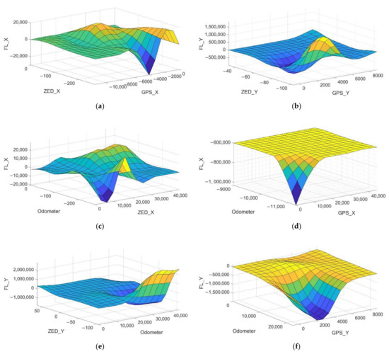 Set of input-output graphs (a–f) in groups of two inputs-one output to observe the response of the fuzzy fusion system of five inputs two outputs. (a) Resulting surface from the causality of the ZED and GPS latitude inputs in the FL system. (b) Resulting surface from the causality of the GPS and ZED longitude inputs in the FL system. (c) Resulting surface from the causality of the GPS latitude and odometer inputs in the fuzzy logic system. (d) Resulting surface from the causality of the ZED camera latitude and the odometer inputs in the fuzzy logic system. (e) Resulting surface from the causality of the ZED camera latitude and odometer inputs in the fuzzy logic system. (f) Resulting surface from the causality of the ZED camera latitude and odometer inputs in the fuzzy logic system.