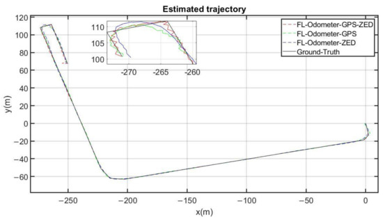 Our method showed a lower error rate than actual methods in the literature in trajectory reconstruction by using the data fusion from the GPS, odometer, and ZED camera. The use of fuzzy systems allows linearizing the combined sensor response; this coincides with the results reported by [23]. The errors obtained by the fuzzy systems were less than the 0.48 m and 15 m reported in [20,23], respectively. In Table 5, the average errors of the three systems are shown. Our proposed system has a smaller average error than the one reported in [20,23]. We can highlight that the responses of the fuzzy system are close to the reference trajectory.