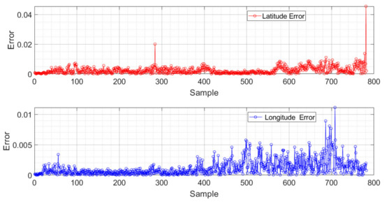 The statistical evaluation was performed using the mean absolute error (MAE) metric. This has the advantage of identifying the outliers predicted by the system. Figure 10 shows the momentary absolute errors of the fuzzy system during the test run. Error peaks of 3.5 m can be observed, although their (MAE) is 0.128 m. This error is caused by predicting an atypical trajectory. This allows us to see the trend in both errors simultaneously. In both cases it is a small error, but the latitude response is affected to a greater extent in rotations (Sample 282) and in drastic speed changes (in Sample 800 of the graph).
