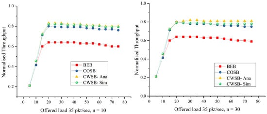 Figure 11 presents the normalised throughput performance under an unsaturated environment for various offered loads that considered 10 and 30 contending stations. Figure 10 also reveals that the throughput of CWSB depends on the number of contending stations or the saturation of the network. Although, for fewer number of users (i.e., 10 contending stations), the normalised throughput had same results until the offered load increased and more stations transmitted the data. However, Figure 10 also shows the degraded performance of BEB, when the number of contending stations increased up to n = 30. In this scenario, the COSB performed better than BEB, whereas CWSB had enhanced throughput even for a higher number of contending stations along with a higher load.