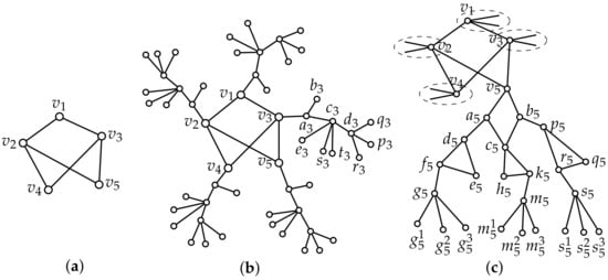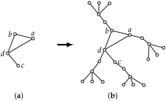 CONSTRUCTION 1: Let be a graph with , then let each vertex be the tree , where , , . Let be the set of disjoint trees corresponding to the graph G. If , then add an edge between the trees and . Therefore, we obtain a graph . An example is shown in the Figure 5a,b. Let be the set of obtained from graphs by CONSTRUCTION 1.