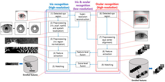 Among the biometric methods, iris recognition is mainly applied in environments that require high security and reliability. Every individual has a unique iris feature pattern, and since the iris barely changes due to aging or external factors, it is ideal for use in recognition. Historically, there have been many studies on implementing iris-based biometrics, and Daugman et al. [12] investigated and implemented a specific system. The dashed blue box on the left in Figure 2 represents the process flow of regular high-resolution image-based iris recognition systems.