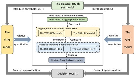 This paper is organized as follows. In Section 2, some basic concepts of HFSs, the original GRS model, and the VPRS model derived from a Bayesian decision procedure are reviewed. Regarding HFEn, Section 3 describes the extension of the GRS model and the VPRS model and analyzes their properties. In Section 4, considering the combination of two kinds of logical operators, two HFEn-based double-quantitative decision-making models (Models 1 and 2) are proposed and their basic internal relations are discussed. In Section 5, a case study is given to illustrate these double-quantitative decision-making methods in the HFEn. Finally, Section 6 gives a summary of this research and further elaborates the future research.