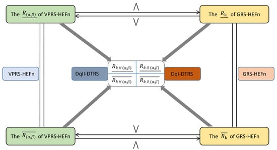 For the GRS-HFEn model, Section 3 shows that the upper and lower approximations in this model can be defined by and , respectively. Therefore, a narrative should be established in theory: We can determine the consistency of the classification of two objects from different equivalence classes by the values of and . As shown in Table 3 and Table 5, there are two types of classification mechanisms, and the specific performance is as follows: For one side, while the values of and are not equal. Finally, and are divided into the lower boundary region and the negative region, respectively. For and , when the values of and are different, and which satisfies is divided into the upper boundary region while that satisfies belongs to the negative region. For the other side, while the values of and are not equal for and . Unlike the previous circumstances, both of them belong to the positive region.