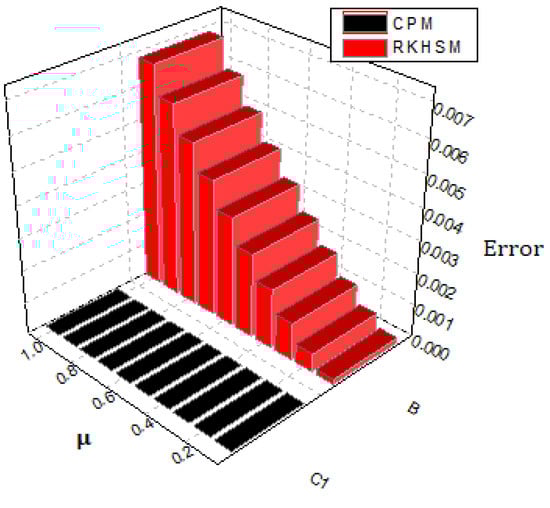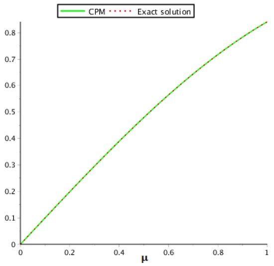 At the accurate solution of the problem is The behavior of the exact and proposed method results are demonstrated in Table 4. Table 5 demonstrates the proposed method and RKHSM error comparison verify that CPM approaches fast as compared to RKHSM, whereas Table 6 shows the behavior of the proposed method at different fractional-orders of problem 2. The graphical view for the exact and proposed method solution are given in Figure 4, while Figure 5 illustrates the comparison of the given techniques on the basis of error. In addition, Figure 6 provides the graphical layout for problem 2 at various fractional-orders. The results we obtained by implementing the proposed technique are better than those of RKHSM.