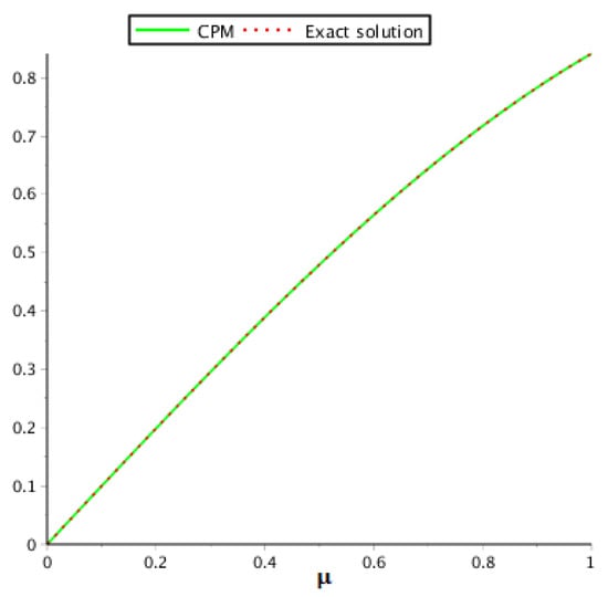 The exact solution of this equation for is . The behavior of the accurate and proposed method result are given in Table 7. Table 8 shows the behavior of the proposed method at different fractional-orders of problem 3. In addition, Table 9 shows the proposed method and POMM error comparison which verify that CPM approaches fast as compared to POMM. The graphical view for the exact and proposed method solution are given in Figure 7, whereas the graphical layout for problem 3 at various fractional-orders is shown in Figure 8.