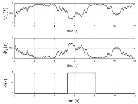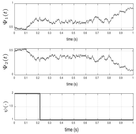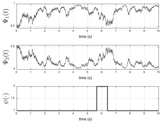 The solution of the Wonham filter equation and the states of the hidden Markov chain are shown in Figure 4. As can be noted, in s, , implying that the Markov Chain with a probability greater than is in state 1 at .