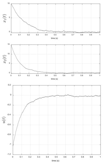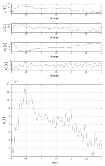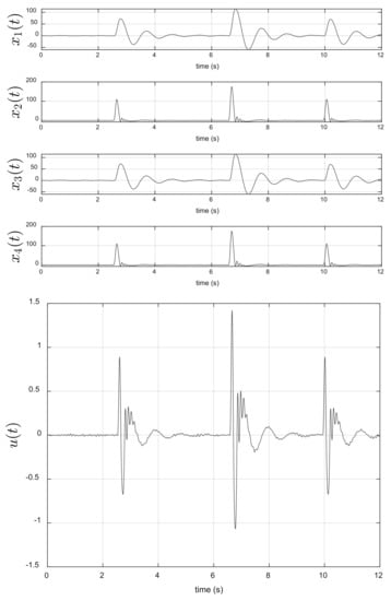 where (road bump height is 10 cm), (road bump height is 16 cm), and , are the random jump times of . In our case, we consider that the dynamic system (64) evolves with additional white noise, that is: