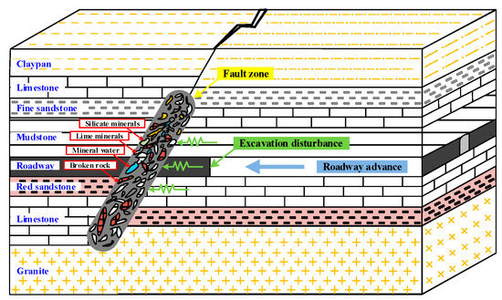 Faults are common geological structures [1,2] encountered in underground mining activities. As shown in Figure 1, the roadway advance faces a hidden fault: the fault rock strata may be in cemented states because the fault zone includes silicate, lime minerals, mineral water, and broken rock and other components [3]. The dynamic stress induced by the disturbance of excavation is inevitably loaded onto fault-cemented strata and may cause failure of the fault’s geological structure. Therefore, investigating the dynamic mechanical properties of fault-cemented rock strata is vital for understanding fault instability mechanisms.