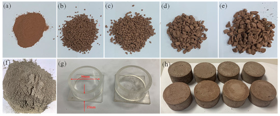 Sample preparation process (a–e): Sieved red sandstone particles; maximum sizes in each group are 2, 3, 5, 8 and 10 mm. (f) Cementation material. (g) Specimen molds. (h) Samples for strength tests: diameter, 50 mm; height, 25 mm.