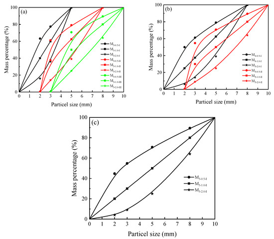Particle size distribution (PSD) in cemented rock samples. (a) S3 series (3 component rock mixture); (b) S4 series (4 components); (c) S5 series (5 components). Mass percentages are cumulative, showing total mass below the indicated size.