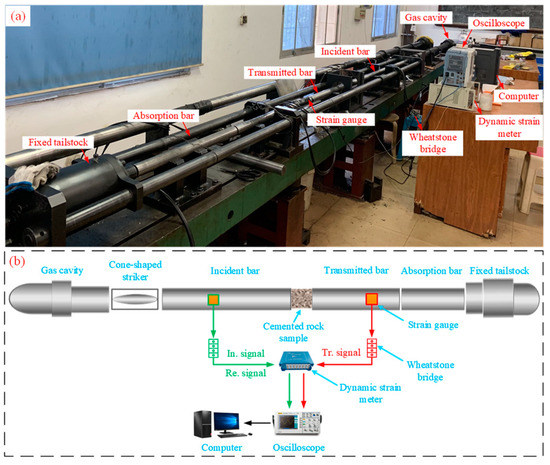 Dynamic impact tests were performed using a modified SHPB system [37]. As shown in Figure 4, the impact device is composed of a gas cavity, cone-shaped striker, incident bar, transmitted bar, absorption bar and fixed tailstock. The data acquisition subsystem includes an acquisition computer, oscilloscope, dynamic strain meter, Wheatstone bridges, strain gauges and a data line.