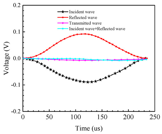 The one-dimensional stress wave propagation theory and stress equilibrium in cemented rock samples should be confirmed during SHPB tests [41]. The strain gauge attached to the incident bar recorded the incident and reflected signals, which were used for the calculation of the incident and reflected waves. The strain gauge attached to the transmitted bar recorded the transmitted signal, which was used to calculate the transmitted wave. As shown in Figure 5, the sum of the incident and reflected waves is approximately equal to that of the transmitted wave. This indicated that the two ends of the cemented rock sample in the dynamic impact experiment reached a stressed equilibrium condition.