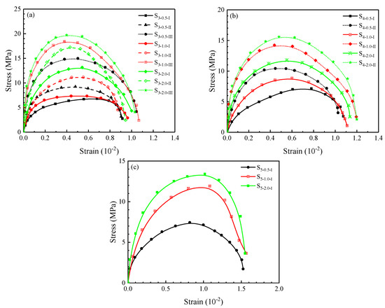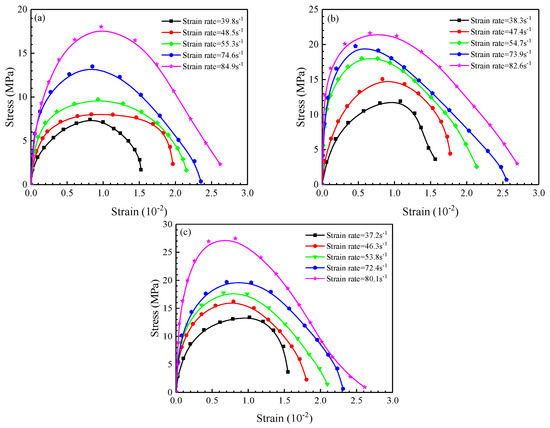 Dynamic stress–strain curves for different PSDs: (a) S3 series; (b) S4 series; (c) S5 series.