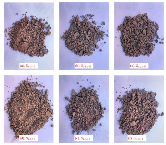 Broken red sandstones were collected from the fault zone of the Sima coal field in the Shanxi province of China. The material collected was subjected to a secondary crushing before manufacturing the cemented rock samples; the sample preparation process is shown in Figure 2.