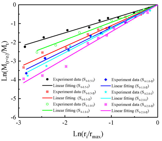 Under the dynamic impact in the SHPB apparatus, the cemented rock samples broke into granular particles. The fractal behavior of cemented rock samples can effectively reflect the fracture characteristics under the dynamic stress, which is an important basis for the instability mechanism of cemented rock strata. As shown in Figure 8, the cemented rock samples exhibited a high degree of fragmentation. Nevertheless, intuitively describing the fragmentation degree of cemented rock samples through fragments is challenging. Therefore, we classified the fragments and analyzed their fractal characteristics to determine the fragmentation degree of the cemented rock samples. After sieving and weighing the fragments, the fractal laws for the cemented rock samples were obtained.