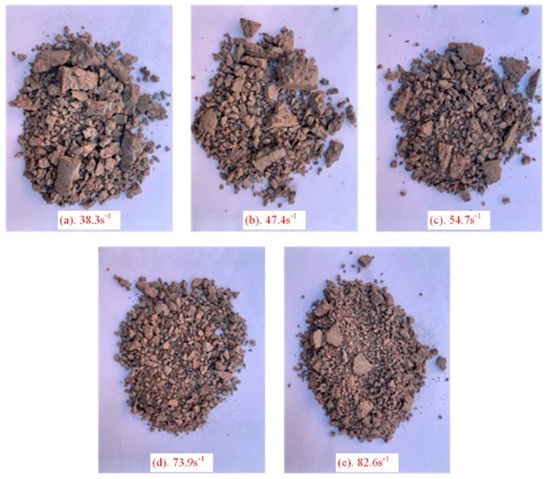 After the broken rock particles are cemented and reshaped, an integral structure has been formed. Dynamic impact damages not only the cementation structure between rock particles but also the rock particles themselves [43]. As shown in Figure 14, many breakages occur in the individual rock particles, which implies that rock particle breakage is a common behavior during dynamic impact. Breakage ratio is a method applied for calculation of the particle broken of cemented rock samples, which is of great significance for investigating the secondary broken of cemented rock samples. Therefore, it is necessary to explore the breakage law of cemented rock samples.