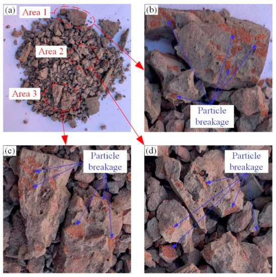 Breakage behavior of rock particles: (a) broken sample after dynamic impact; (b) area 1; (c) area 2; (d) area 3.