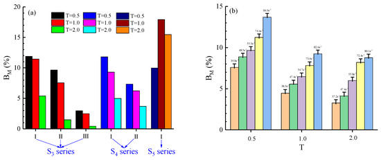 The breakage ratio was calculated using Equation (8) and the results are shown in Figure 15. As for the effect of PSD on breakage behavior, the breakage ratio BM (indicating a change in the PSD) appears to decrease with an increase in the Talbot index in the S3 and S4 series of cemented rock samples, except for the S5 series of cemented rock samples (as shown in Figure 15a). A high Talbot index corresponds to more large rock particles in the cemented rock sample, which verifies that large particles contribute to the formation of the solid structure of the cemented rock sample. As for the effect of strain rate on breakage behavior, BM obviously increases with an increase in strain rate (as shown in Figure 15b).