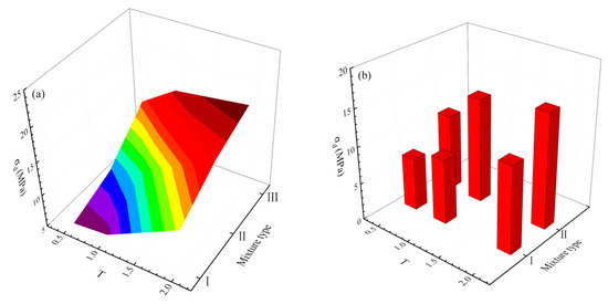 From the test results in Section 4.1, the PSD has a remarkable influence on the dynamic strength of cemented rock samples. Figure 16a shows the dynamic strength variation of the S3 series with the PSD, which indicates that the dynamic strength increases with an increase in both the Talbot index and mixture type; these indicate cemented rock samples containing more large rock particles, which can create dynamic strength. This behavior is also seen in the S4 and S5 series (Figure 16b,c).