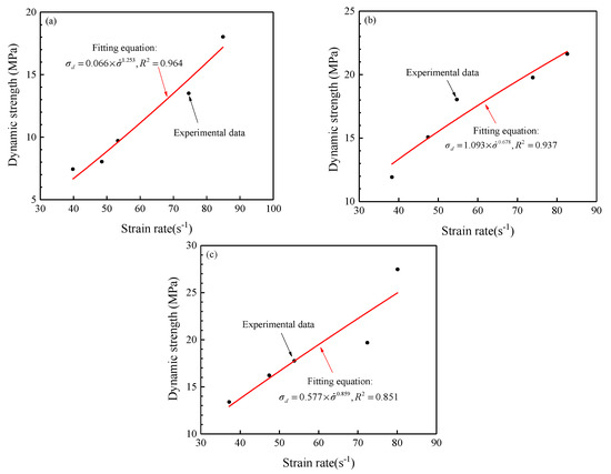 Under the action of dynamic impact, the dynamic strength of the rock material follows the rate effect [44]. Figure 17 shows the variation of dynamic strength with strain rate in the S5 series of cemented rock samples; Figure 17a–c corresponds to the different Talbot indices (T = 0.5, 1.0 and 2.0) that denote different PSDs. The dynamic strength and strain rate in the experimental data are well fitted by the power function.