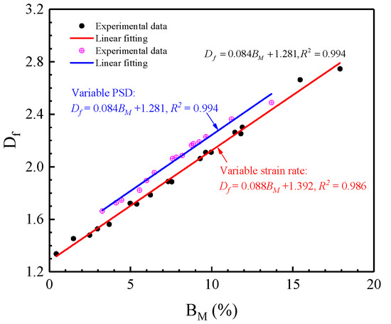 Relationship between breakage ratio and fractal dimension following fragmentation. Breakage ratio BM indicates change in PSD of original rock particles. Blue curve arises from samples having different initial PSDs; red curve is from different strain rates being applied.