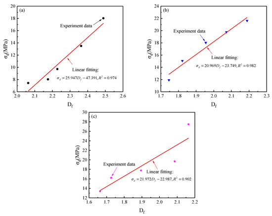 Figure 22 shows the effect of strain rate on the relation between dynamic strength and the fractal dimension for samples with different Talbot indices; the experimental data (Table 3) show that the dynamic strength increases with increasing fractal dimension for sample sets with different Talbot indices (as shown in Figure 22a–c). When the PSD remains unchanged and only the strain rate is changed, the fractal dimension is positively correlated with the dynamic strength, as seen through linear fitting. This phenomenon indicates that for the same values of the PSD, the strain rate directly determines the dynamic strength and fractal characteristics of the cemented rock sample, with both exhibiting the same response characteristics as the strain rate effect. Therefore, a positive linear correlation exists between dynamic strength and fractal dimension.