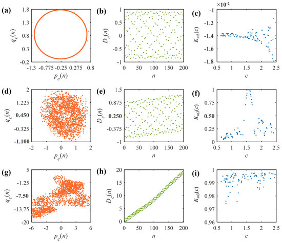 The detection results of the 0-1 test for chaos when it is used to detect the cascade L-C system with different values of : from (a–c): , periodic dynamic; from (d–f): , weak-chaotic dynamic; from (g–i): , strong-chaotic dynamic.